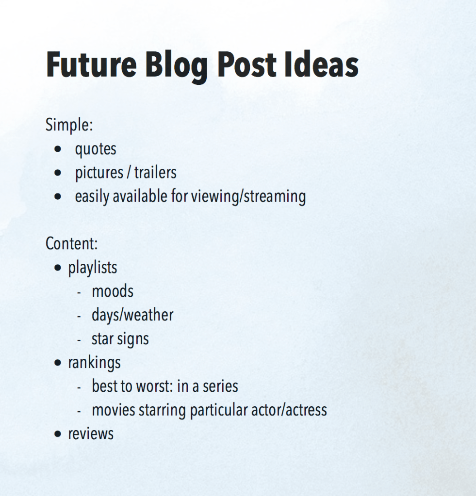 While prototyping and posting a range of more art-based blogs, I realised I wasn’t as interested in my project as I hoped. It felt more like a chore than a body of work I could be proud of. It wasn’t until I wrote my Harry Potter blog, that I realised I wanted to gear more towards movie-based topics. The film industry has always been something I’ve been interested in, and I knew it would give me more of a chance to improve upon my blog. As a result, I have altered the concept of my project. Still sticking with the ‘pastime’ & ‘boredom’ theme, I will be focusing more on ranking movies and creating playlists for certain kinds of days or moods. This, too, would allow me to find more of a niche audience that I could cater to, more specifically.