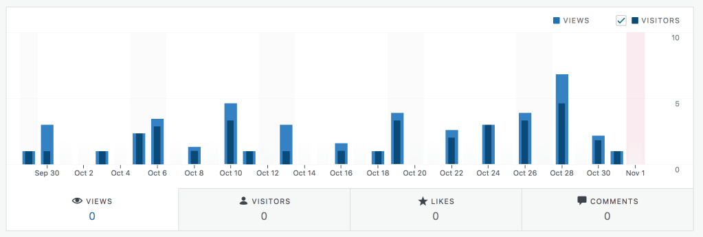 The analytics above show the user engagement throughout September and October; spiking on the days I uploaded a blog post. This shows me that my audience are actually interested in the content I post, positively impacting my project as a whole.
