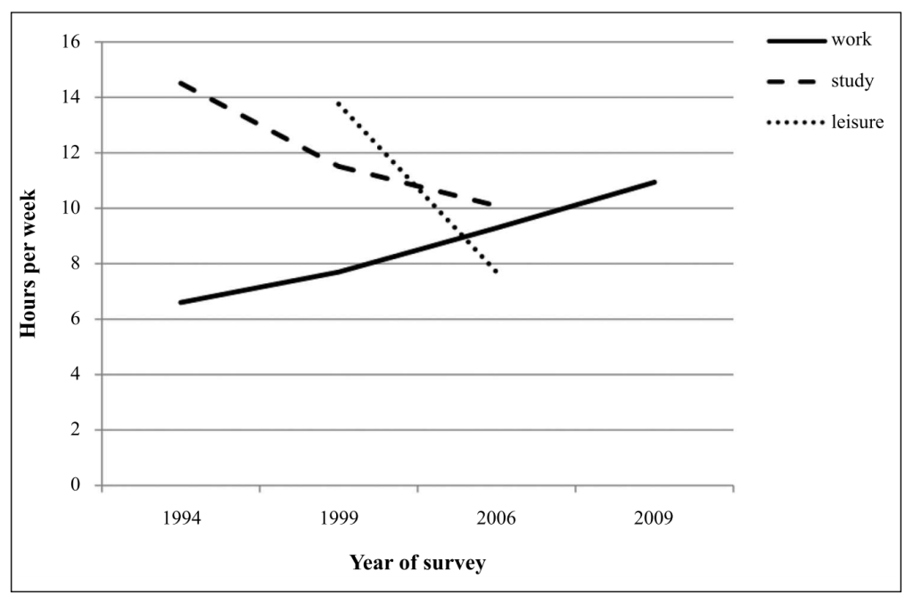 Similarly, a figure shown in the study by Hall depicted a decrease in leisure activities amongst working uni students between 1999 and 2006, dropping from an average of fourteen hours to just eight hours a week (Hall, 2010). However, the average amount of hours spent at work actually increased four hours a week. This tells me that, each year, students are spending more time working and less time on their hobbies, making it difficult to relieve stress from work and uni, whether that be through painting, walking or swimming. This, I believe, is a contributing factor to a student’s loss of identity.