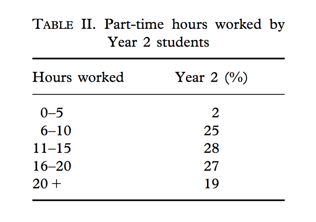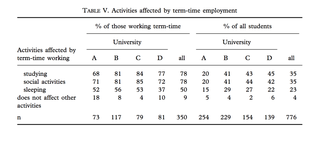 I looked at a very interesting study, attached below, done by Metcalf in 2003, showing the effects that term-time work has on university activities, by comparing term-time workers with the entirety of the class. A student’s study time, social life and sleeping schedule are all especially important in being an efficient student, and those three aspect are all being effected dramatically by term-time work.