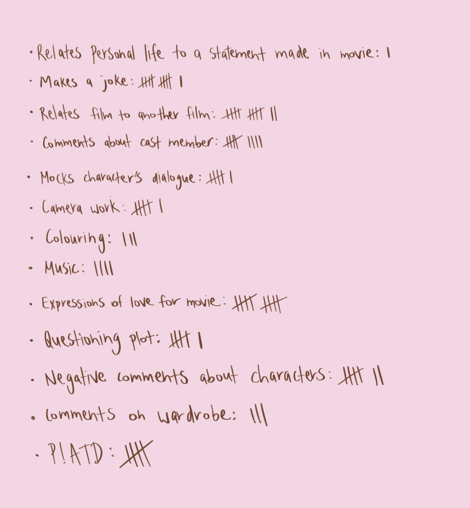 The brief 2-minute introduction consisted of comments about the background of the film, its previous response by fans and the media, some of the controversy surrounding it, and concluding with the movie’s genre. A list, as well as a tally, was made throughout the reaction part of the video, which is embedded above. The most objective comments were made about the film’s colouring and camera work. However, the more subjective comments included Trin’s love for the film, and her thoughts about the dialogue and storyline choices. The concluding statement consisted of comments about the chemistry between the actors, praise for how well it was written and directed, and her appreciation for having a female director.