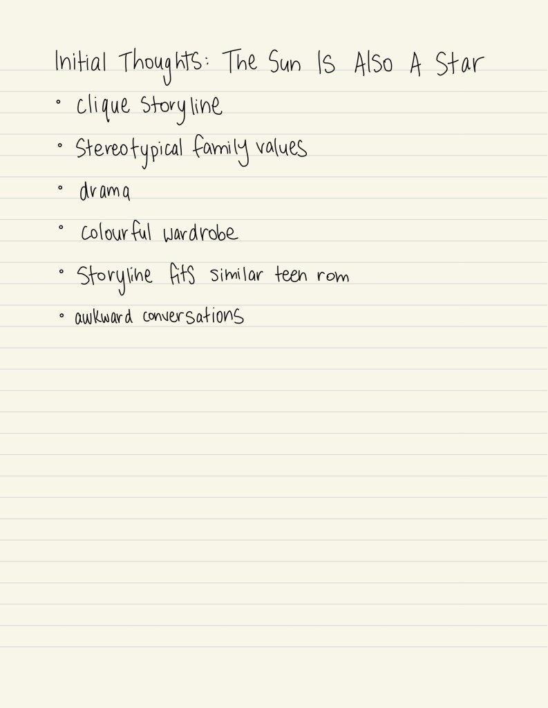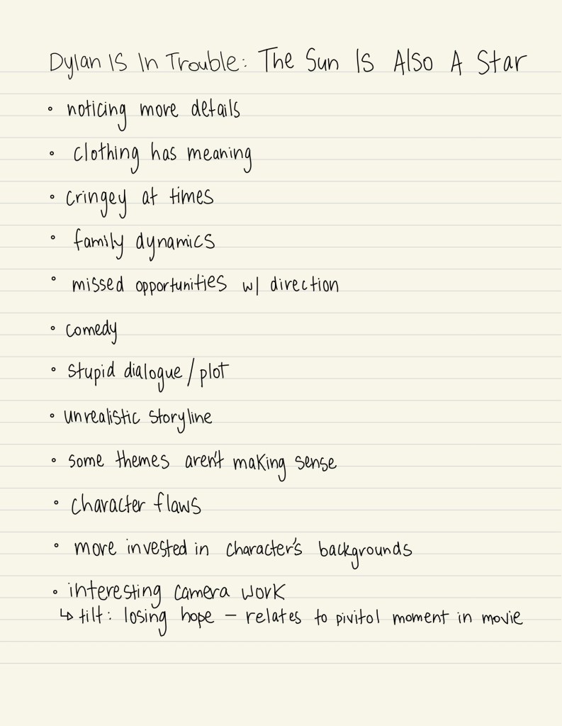 In order to test this out and experience this change first hand, I sat down and watched The Sun Is Also a Star on Stan, while compiling a list of my initial thoughts of the film. This was done with no prior knowledge of the film, and no external influence. I made sure to include key aspects of the film — from the lighting, to the camera work, and dialogue — to ensure my scope was large enough to work with. I then waited a couple of days to refresh my mind, before watching Dylan Is In Trouble react to the film. I, again, took notes of my thoughts and feelings, but this time, had Dylan’s thoughts to influence my own. I then compared the two sets of notes.